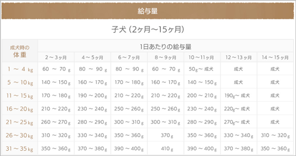栄養要求量は個体差があります。実際にあげる時は、目安量を元に便の様子を見ながら1日あたり10%程度ずつ量を調節してあげて下さい。便は食べすぎると軟便に、少ないと硬くなる傾向にあります。
